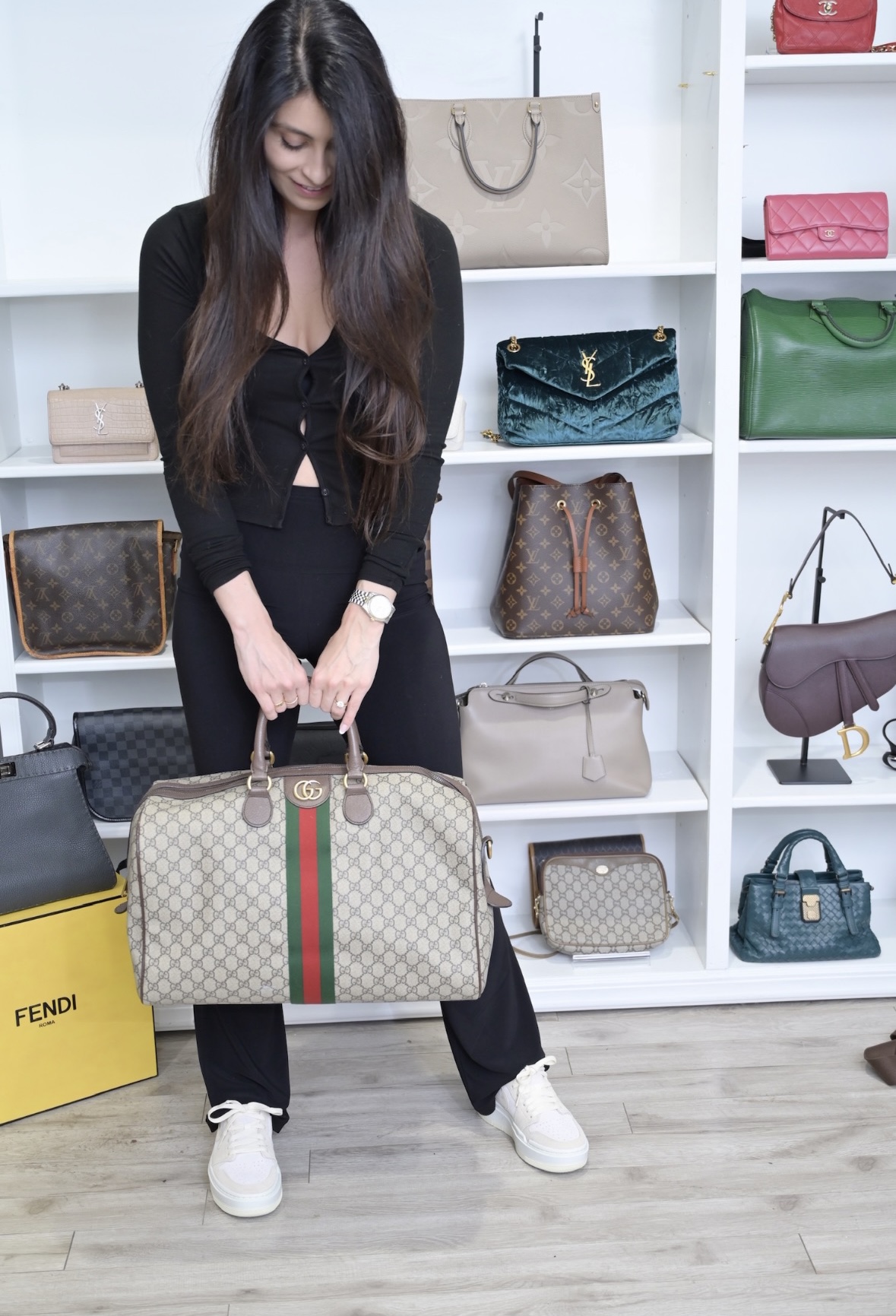Lena holding Louis Vuitton Designer Handbags. Buying and selling designer handbags brands Louis Vuitton, Chanel, Goyard, Hermes', Prada, Gucci, Tiffany & Co., Burberry, and more.