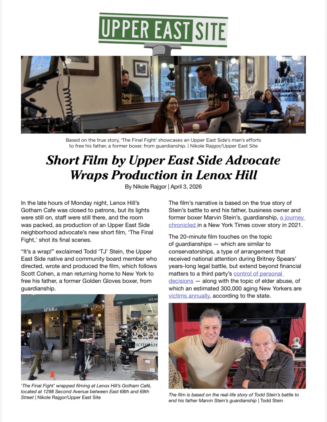 The project recently received coverage from Upper East Site, which documented the film’s final days of production in Lenox Hill and highlighted the strong emotional connection between the film’s story and the neighborhood where Stein’s real-life experience unfolded. Filming included key scenes at Gotham Cafe, a location central to both Stein’s personal history and the spirit of the film.